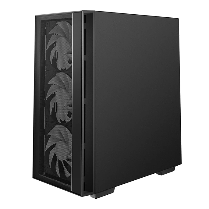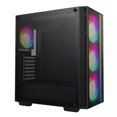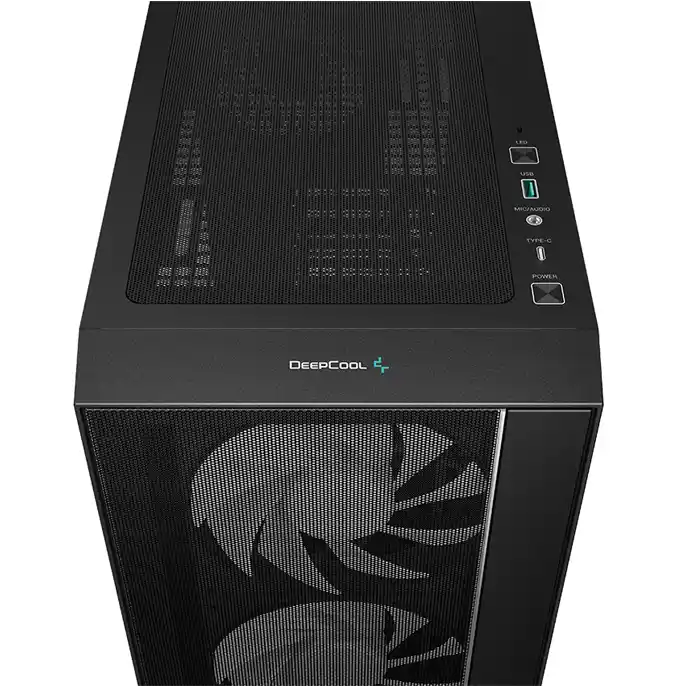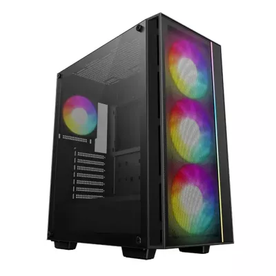 کیس دیپ کول مدل MATREXX 55 MESH V4 C با طراحی مینیمال و پنل جلویی مشبک (Mesh) ساخته شده که نهتنها ظاهری شیک و مدرن دارد، بلکه جریان هوای عالی را برای خنک کردن قطعات فراهم میکند. پنل کناری از شیشه حرارتدیده (Tempered Glass) با ضخامت 4 میلیمتر ساخته شده که به شما امکان میدهد اجزای داخلی سیستم خود را به زیبایی به نمایش بگذارید. این شیشه شفاف، بهخصوص در کنار نورپردازی ARGB، جلوهای خیرهکننده به سیستم شما میبخشد.