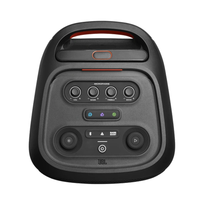 دکمه‌ی پاور، دکمه‌های افکت‌های صوتی، غلتک تنظیم Echo، غلتک تنظیم TREBLE، غلتک تنظیم BASS، غلتک تنظیم صدای اسپیکر، دکمه‌ی بلوتوث، دکمه‌ی تقویت باس، دکمه‌ی تنظیم نورپردازی