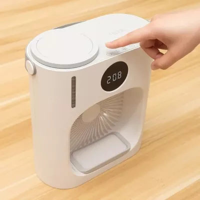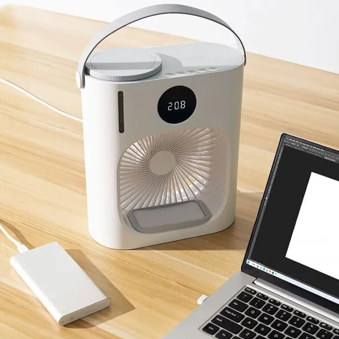 ظاهر جذاب کیفمانند پنکه رومیزی شیائومی مدل Xiaomi Lydsto cl08 اولین چیزی است که توجه شما را به خود جذب خواهد کرد. این فن خنککننده با ظاهر مکعبی با لبههایی گرد دارای مخزن نسبتا بزرگی است که در آن روی سطح بالایی دستگاه قرار دارد. در کنار این در، دکمههای لمسی کنترل قرار دارند که میتوانید جریان هوا و بخار را با آنها تغییر دهید.